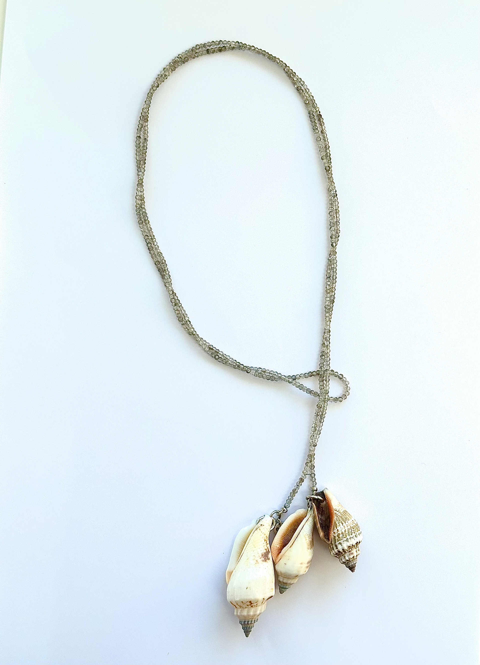 This necklace features shimmering smoky quartz beads with a soft, natural sparkle. Unique seashell pendants add an organic, ocean-inspired touch. Designed as an open necklace, it can be wrapped, tied, worn double, or styled creatively - a versatile piece to wear your own way.
