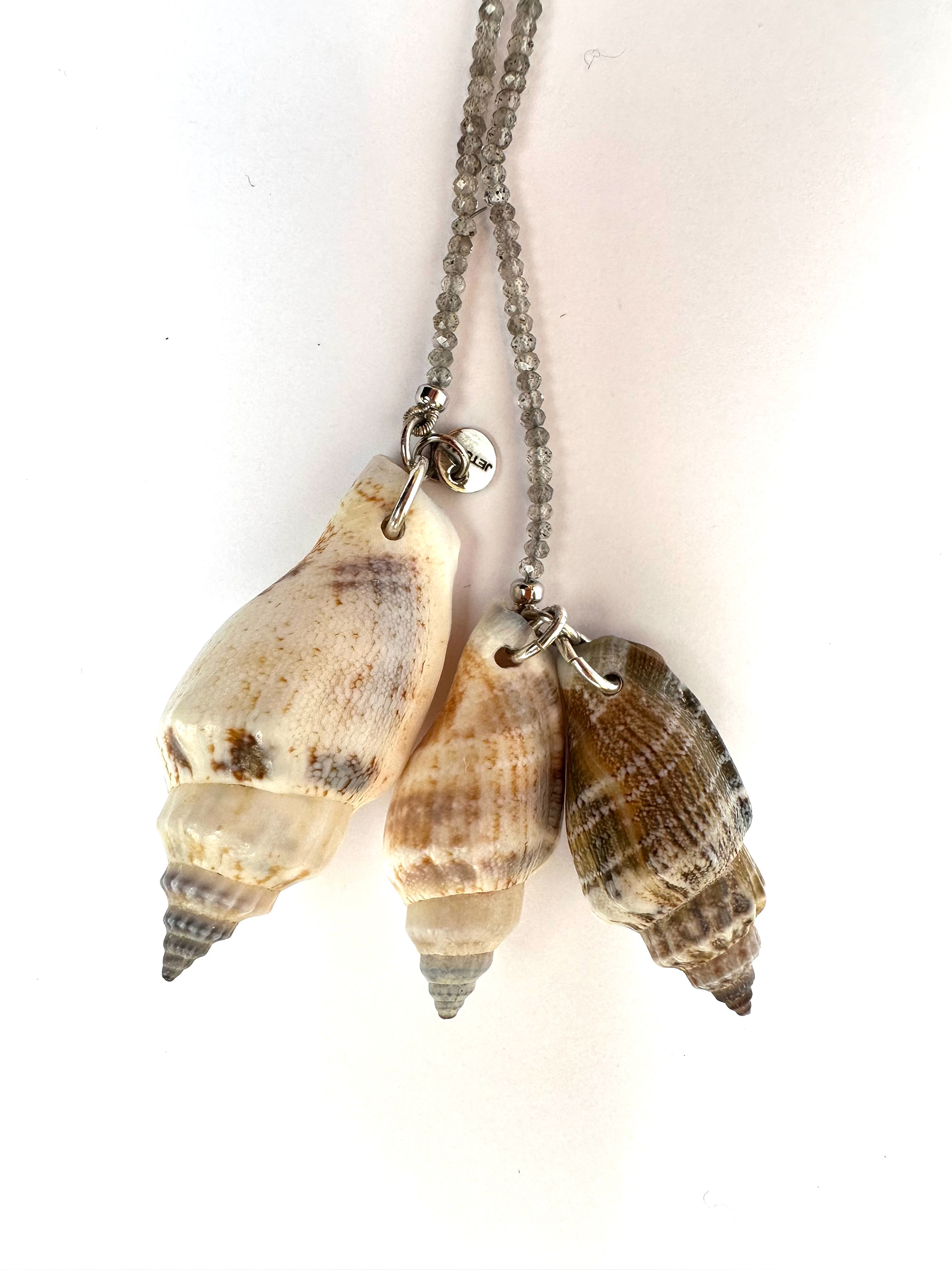 Unique handpicked seashells. Open smoky quartz chain. Silver metal pieces.
