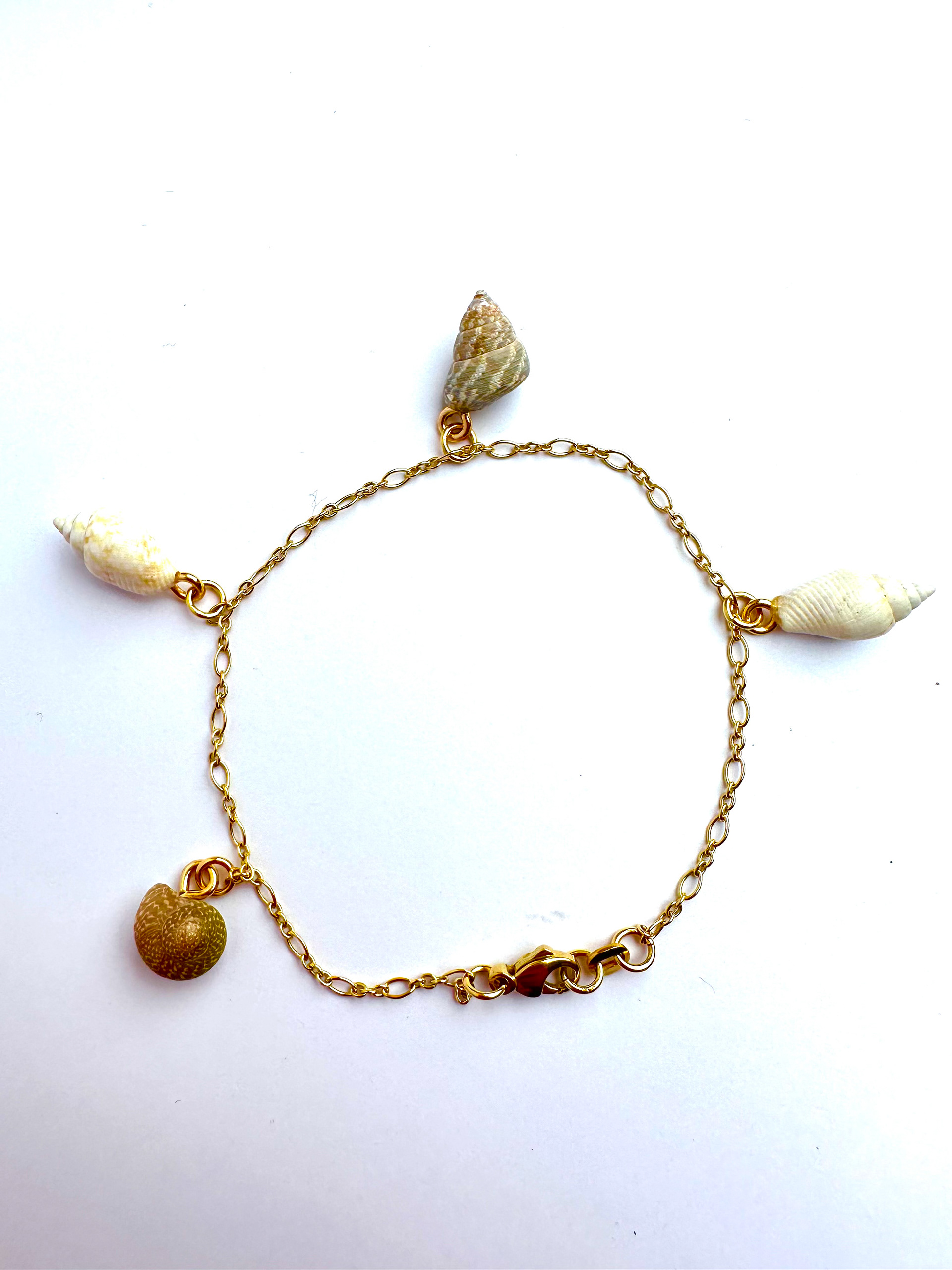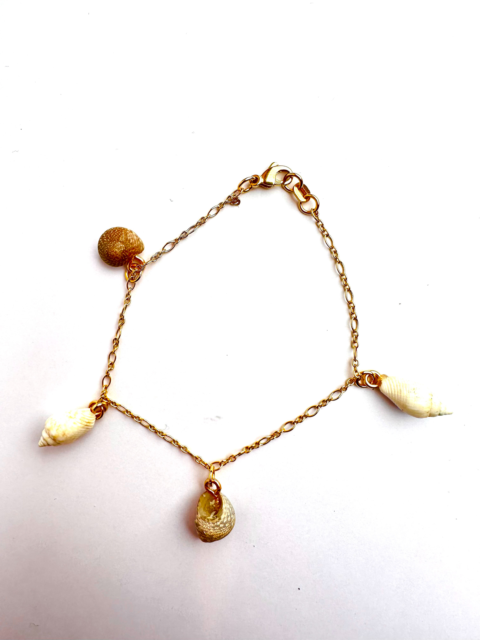 This delicate charm bracelet features a fine rose gold (750) anchor-chain adorned with unique seashell charms in soft, natural shades of cream, beige, and warm browns. Simple and natural - a subtle statement inspired by the sea.