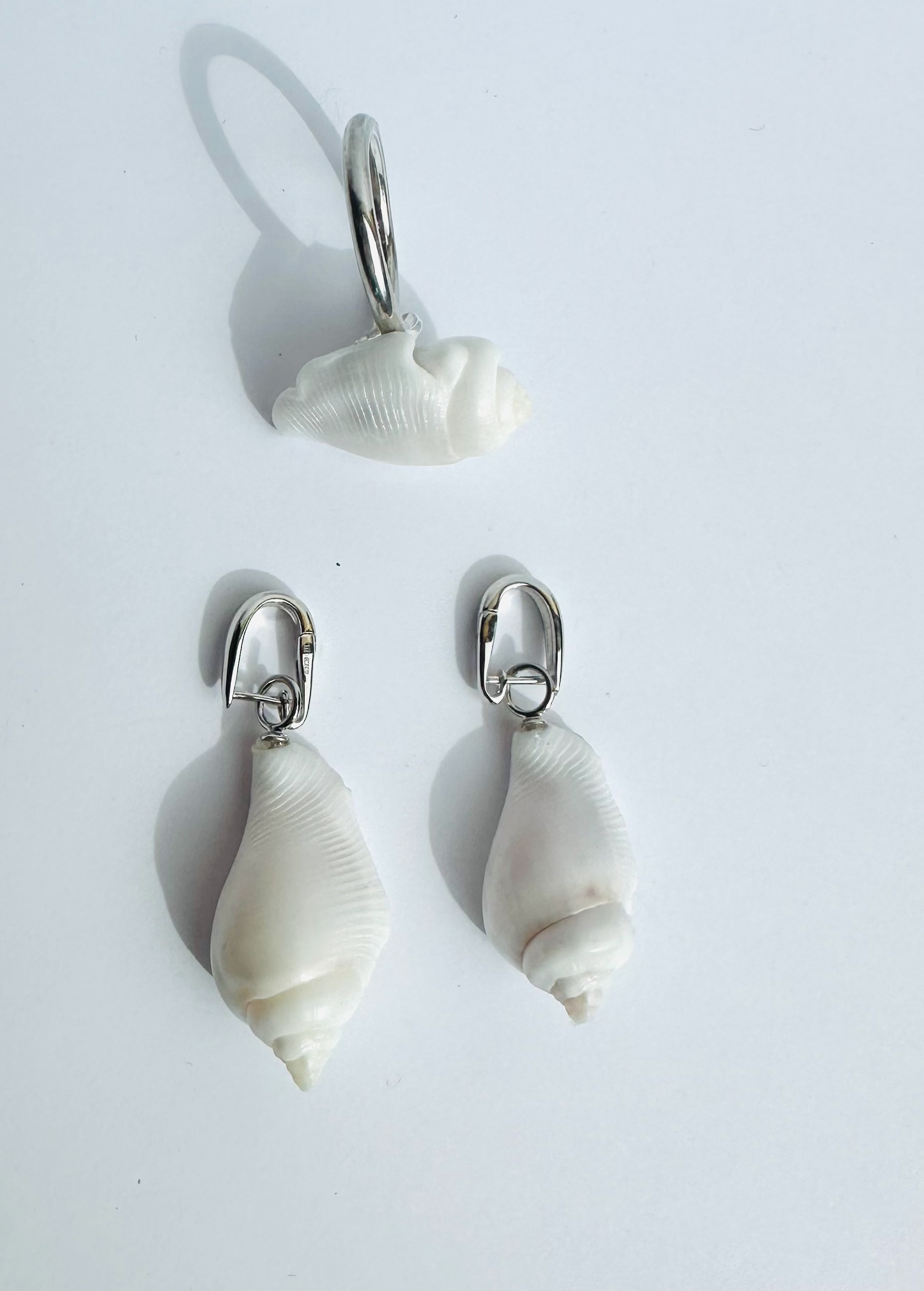 The removable shell pendants allow the hoops to be worn in two ways: adorned with the sculptural shell drops for a distinctive look, or simply as classic sterling silver hoops for a clean, minimalist style. A versatile piece that blends natural beauty with effortless elegance.