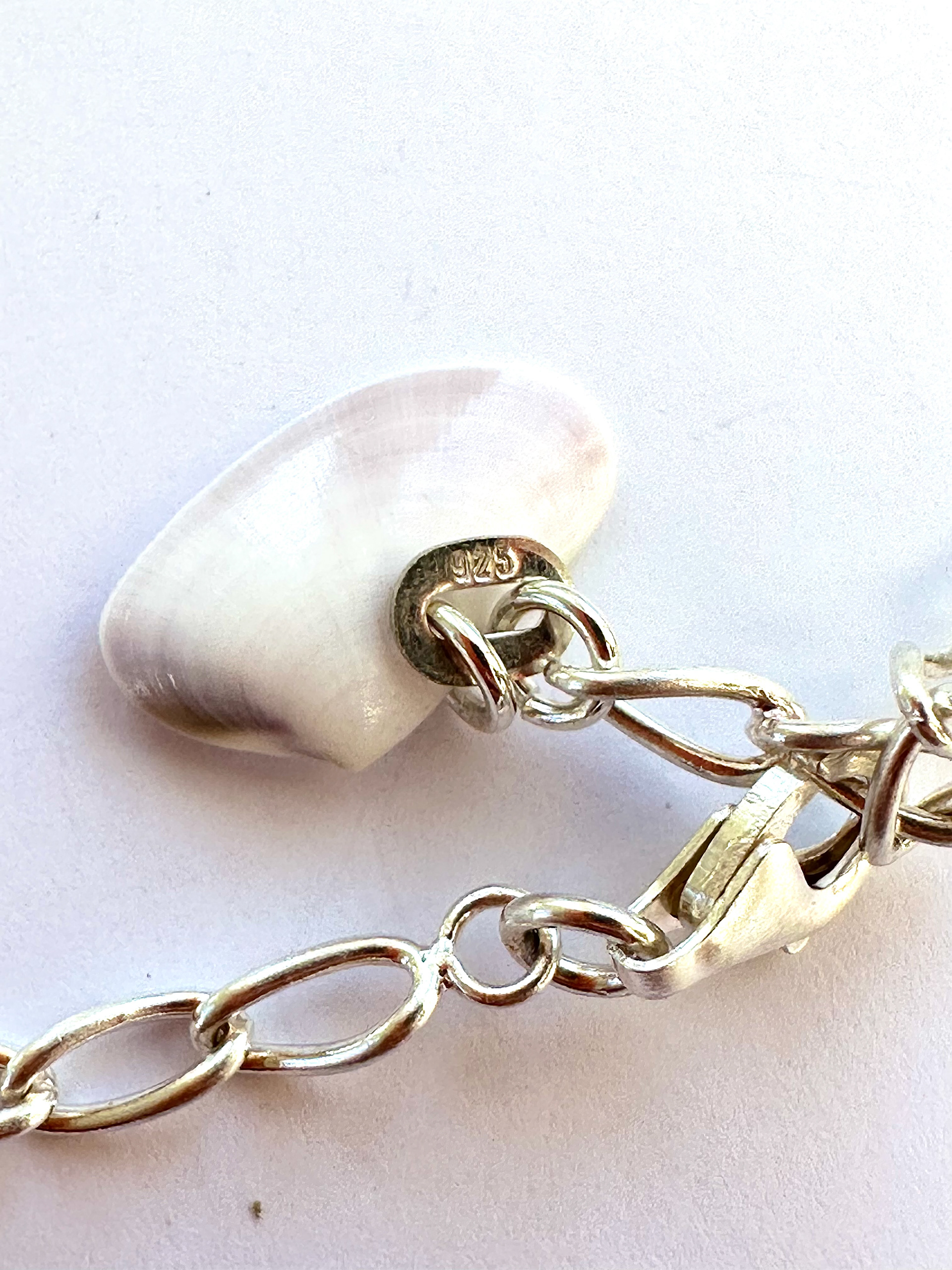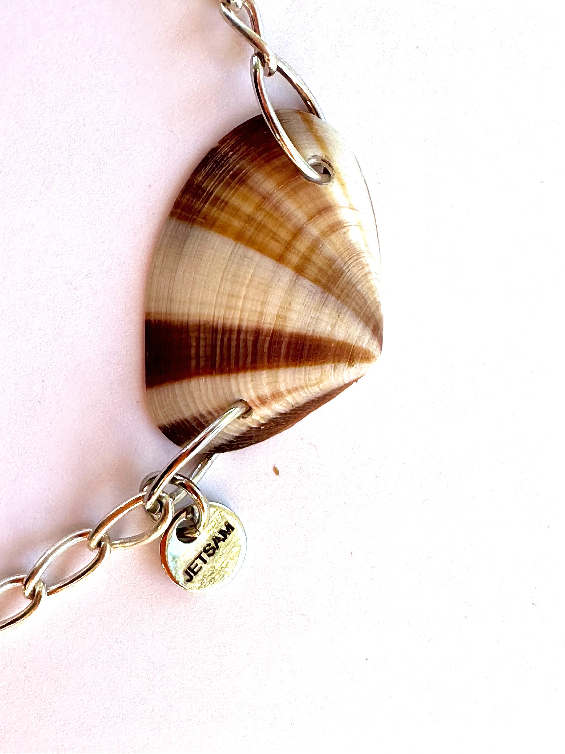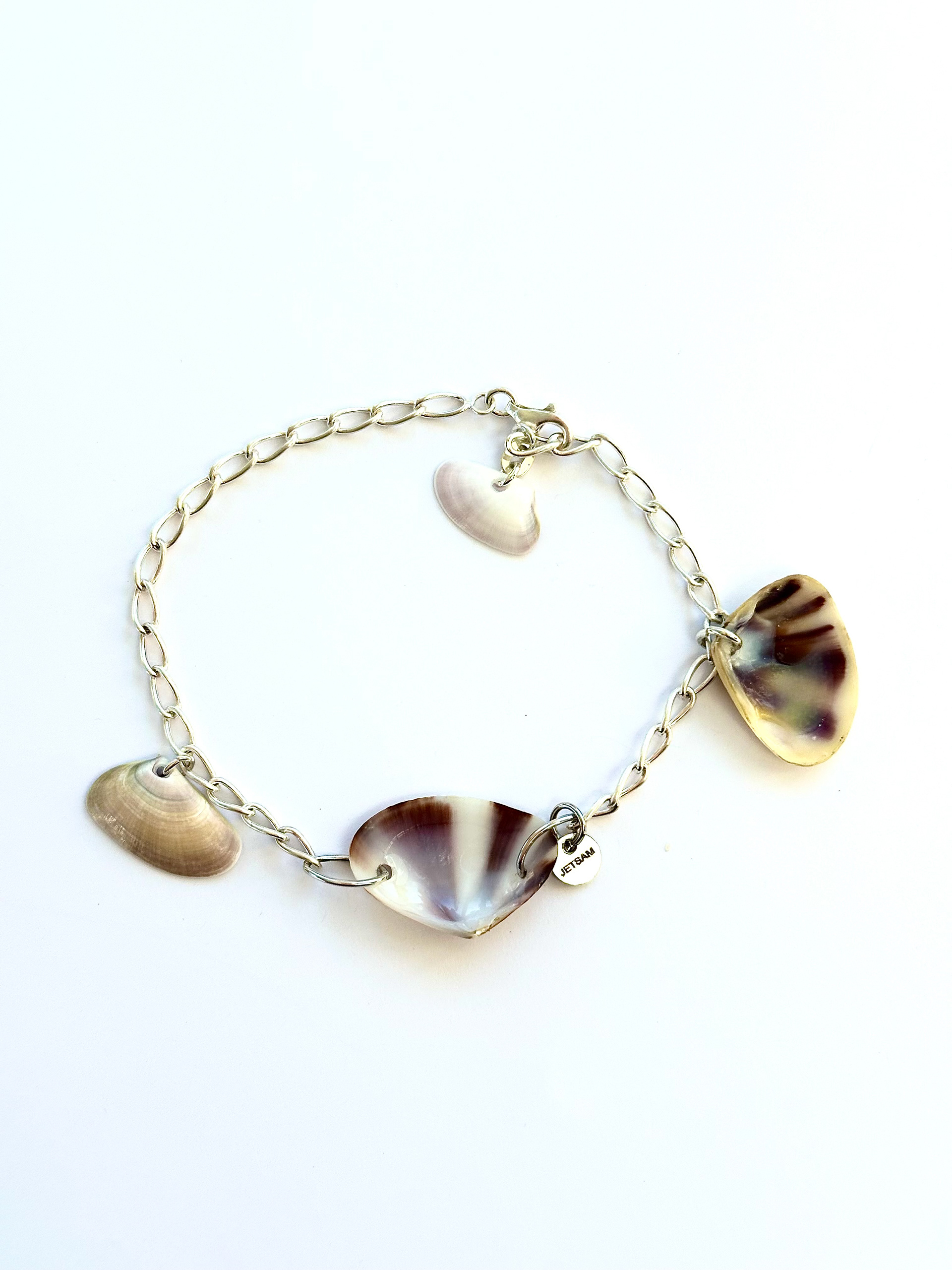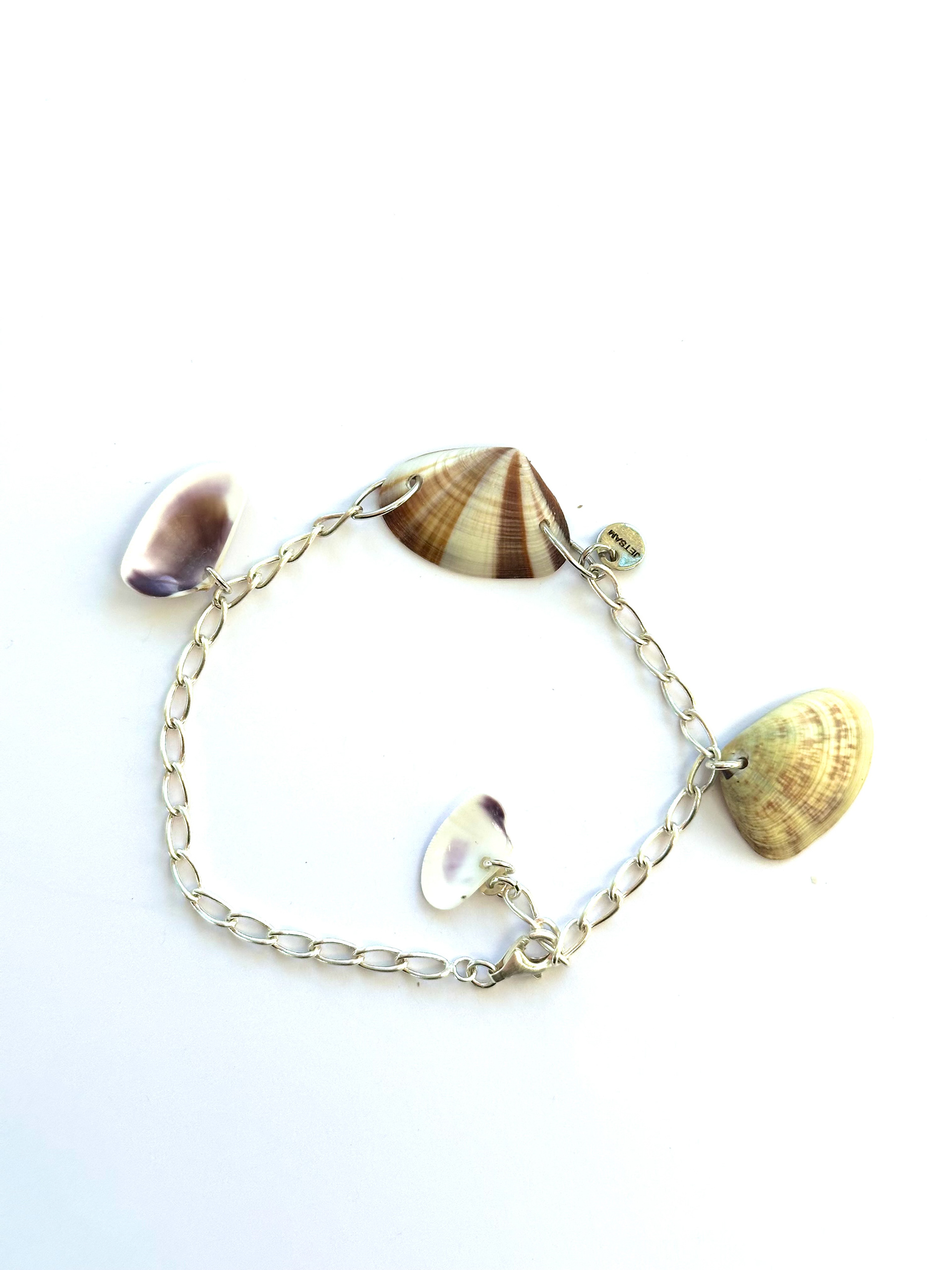 This delicate bracelet features a fine silver-toned chain adorned with unique seashell charms in soft natural shades of cream, beige, and warm browns. Finished with a small signature tag. Simple and natural - a subtle statement inspired by the sea.