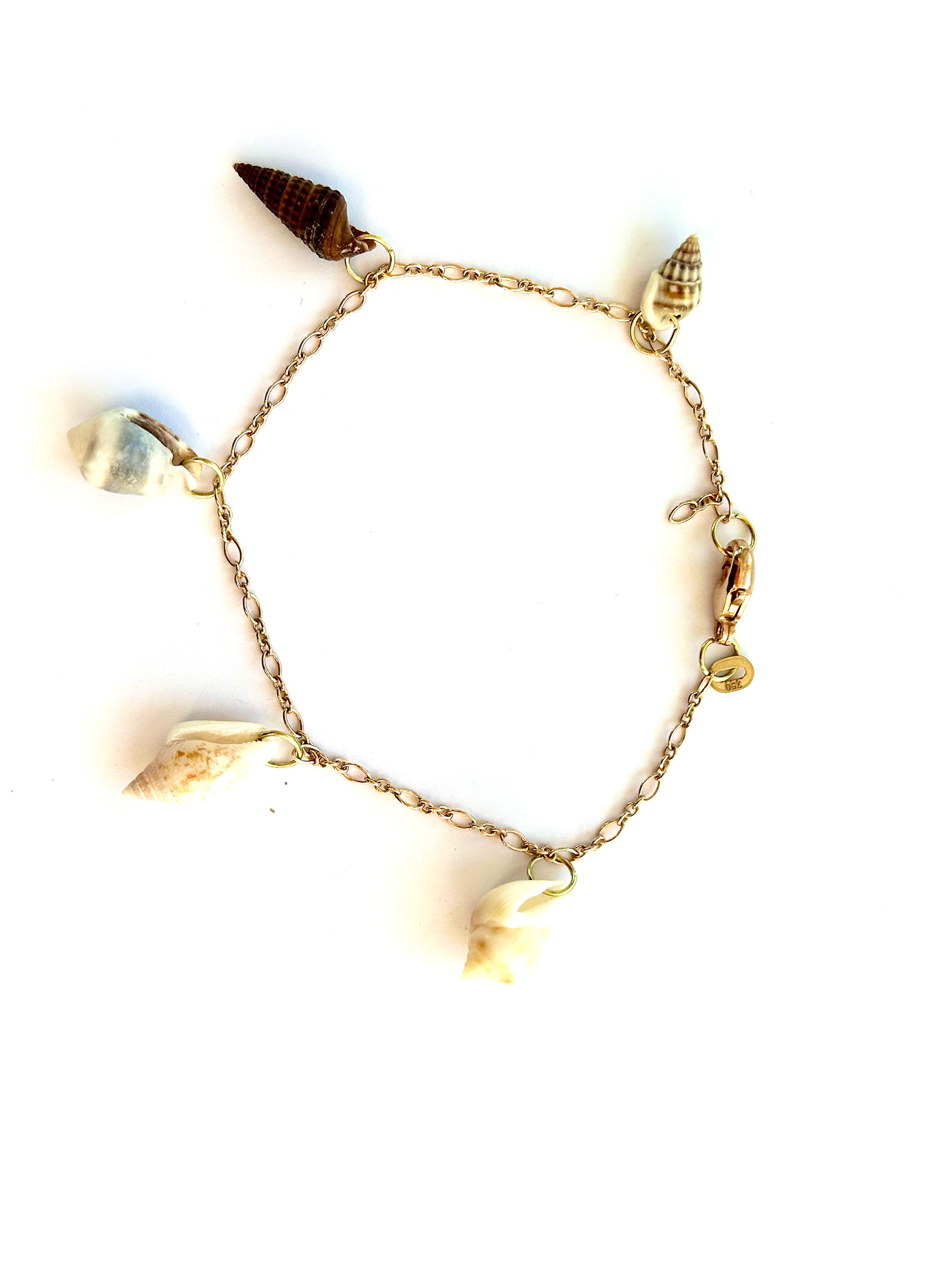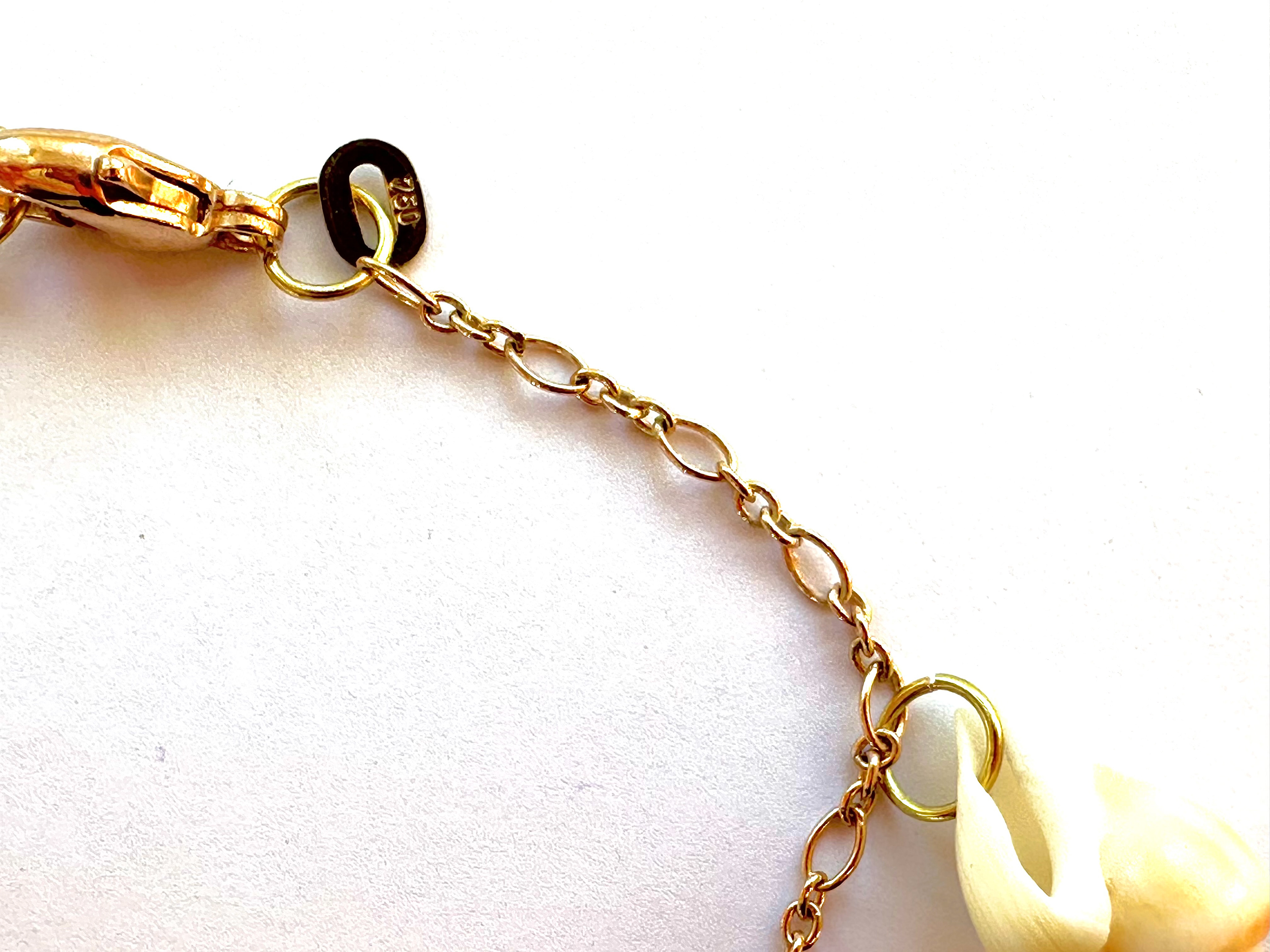 This delicate charm bracelet features a fine yellow Gold (750) anchor-chain adorned with unique seashell charms in soft natural shades of cream, beige, and warm browns. Simple and natural - a subtle statement inspired by the sea.