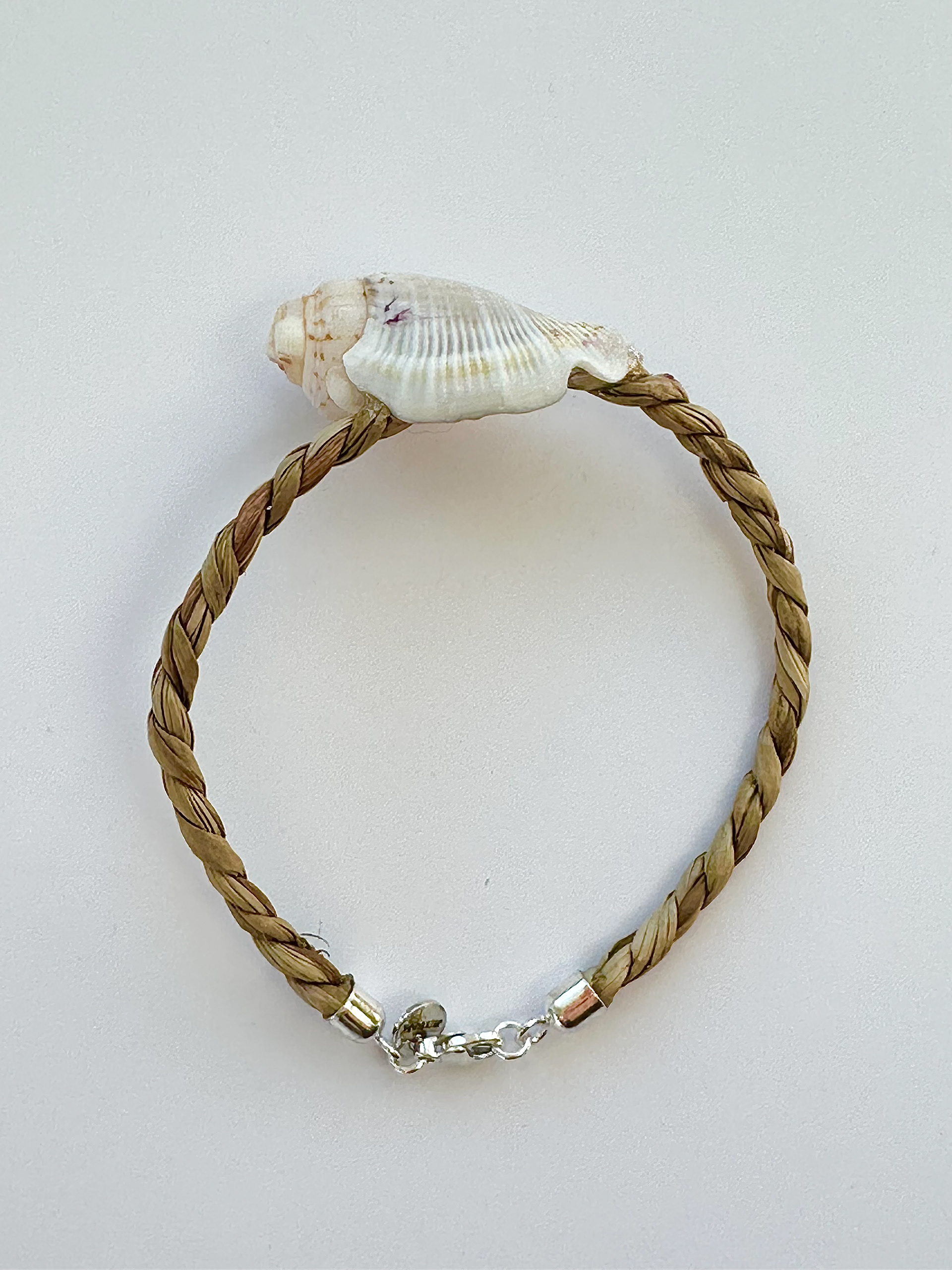 Unique handpicked Seashell. Seagrass strap. Silver metal items.