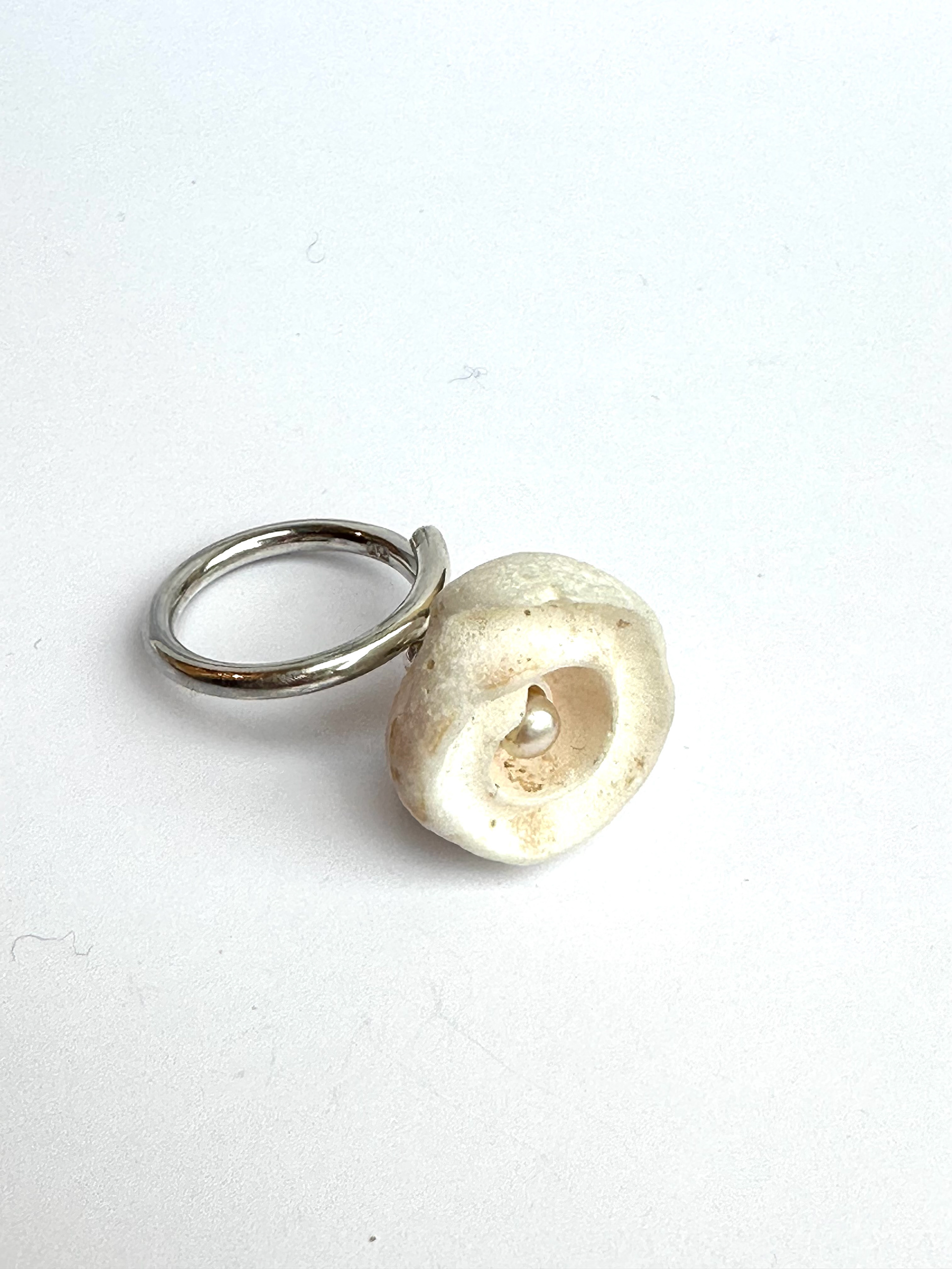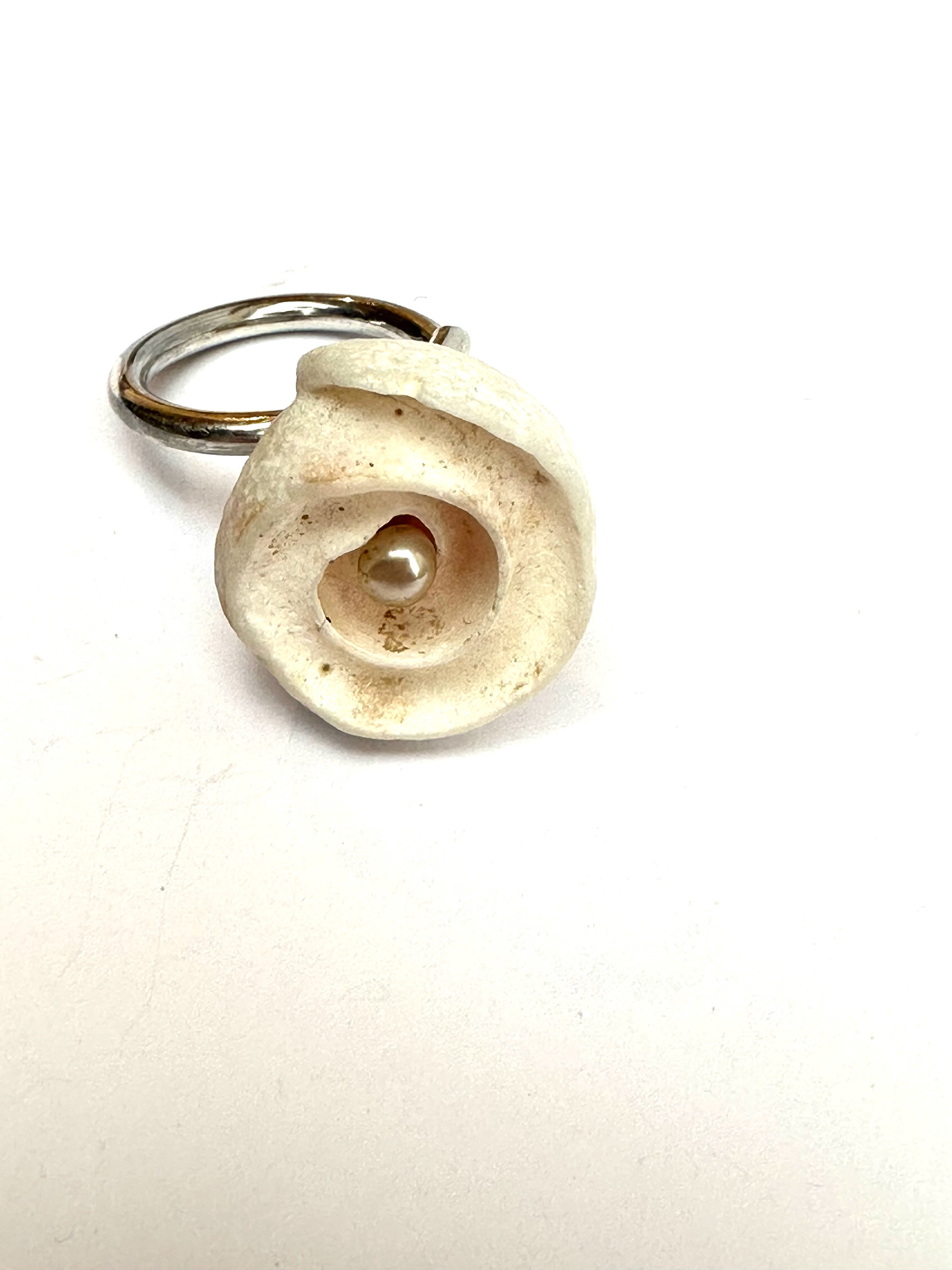 This unique ring features a naturally formed shell fragment resembling a delicate rose in bloom. At its heart rests a luminous freshwater pearl - a soft, radiant contrast to the raw beauty of the ocean-worn shell. Set on an adjustable sterling silver (925) band.